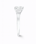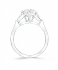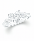 خاتم ثلاثي مرصع بماسة واحدة كبيرة مركزية بقَطع قلب، وماستين جانبيتين بقَطع باقيت، مصنوع من الذهب الأبيض عيار 18 قيراط.