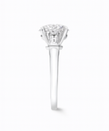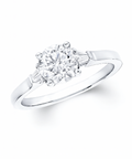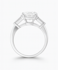 خاتم ثلاثي مرصع بماسة واحدة كبيرة مركزية بقَطع دائري، وماستين جانبيتين بقَطع باقيت، مصنوع من الذهب الأبيض عيار 18 قيراط.