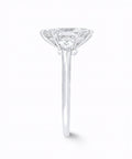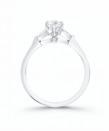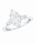 خاتم ثلاثي مرصع بماسة واحدة كبيرة مركزية بقَطع ماركيز، وماستين جانبيتين بقَطع كمثرى، مصنوع من الذهب الأبيض عيار 18 قيراط.