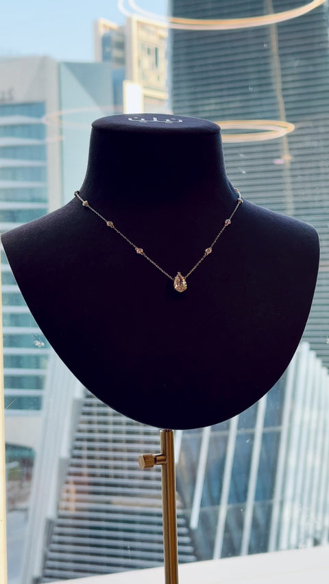 قلادة سولتير مختبري مرصع بماسة بقَطع كمثرى، بحجم 3.12 قيراط، بنقاء VS1، لون G. مرصعة بثمان ماسات جانبيةبحجم 3mm. مصنوعة من الذهب الأبيض عيار 18 قيراط. مع شهادة.